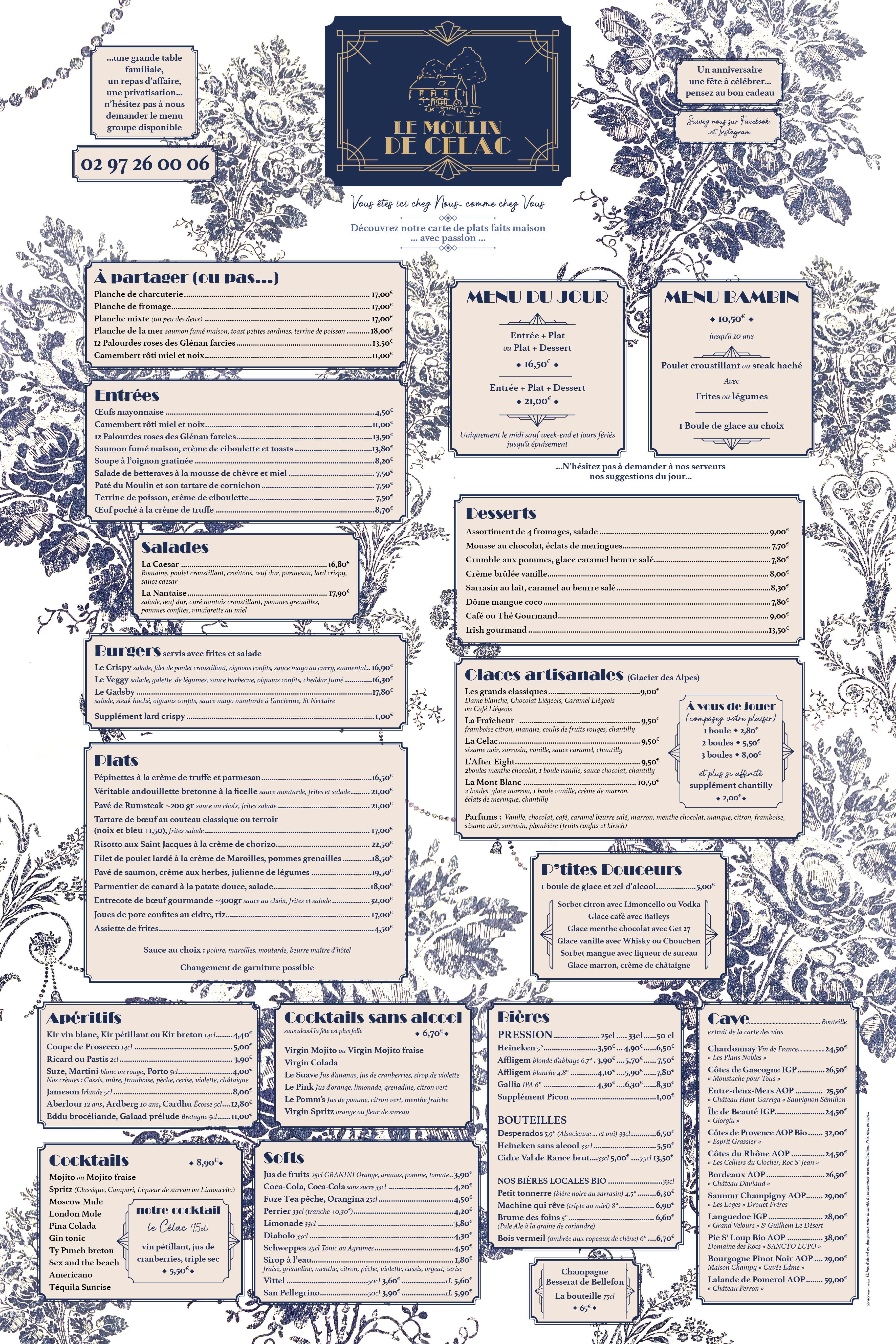 Au Moulin de Célac, chaque plat est préparé avec soin par notre chef passionné, qui met un point d'honneur à travailler des produits frais et de qualité. Que ce soit notre menu du jour, notre carte ou nos menus festifs, tout est fait maison pour vous offrir une expérience culinaire authentique, riche en saveurs et en tradition. Venez déguster une cuisine sincère et gourmande dans notre brasserie-restaurant au charme vintage !